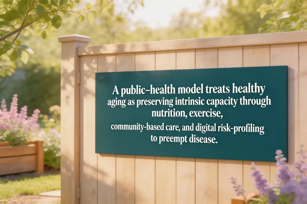 A public‑health framework treats Healthy Aging as preserving intrinsic capacity—physical, mental and social well‑being—through preventive nutrition, Mediterranean‑style diets, regular aerobic and resistance exercise, and community‑based integrated care. By shifting from disease‑centric treatment to capacity‑building, policymakers can blunt the rise in multimorbidity, lower disability‑free life‑expectancy gaps, and ease pressure on health‑care and pension systems. Multidisciplinary models that link primary care, social services, and health‑education empower older adults to remain functionally independent.