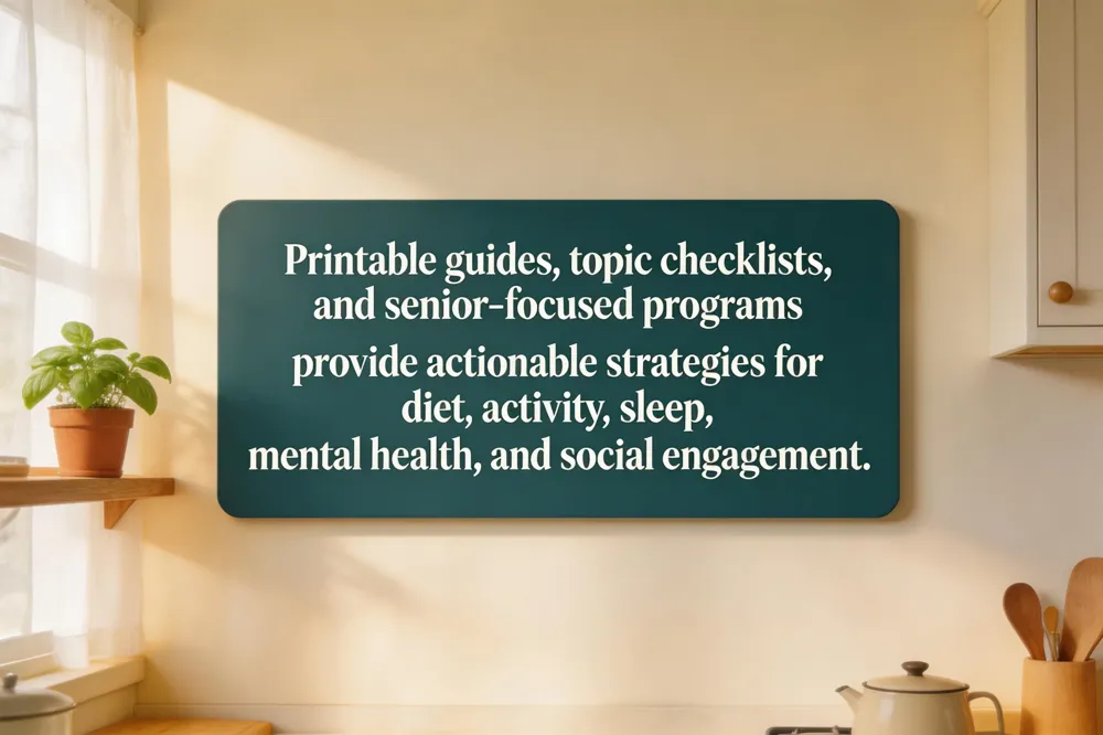 Healthy Aging Topics: Core topics include balanced nutrition, regular aerobic and strength activity, adequate sleep, mental stimulation, vaccinations, screenings, chronic disease management, fall‑prevention, social connection and care planning.