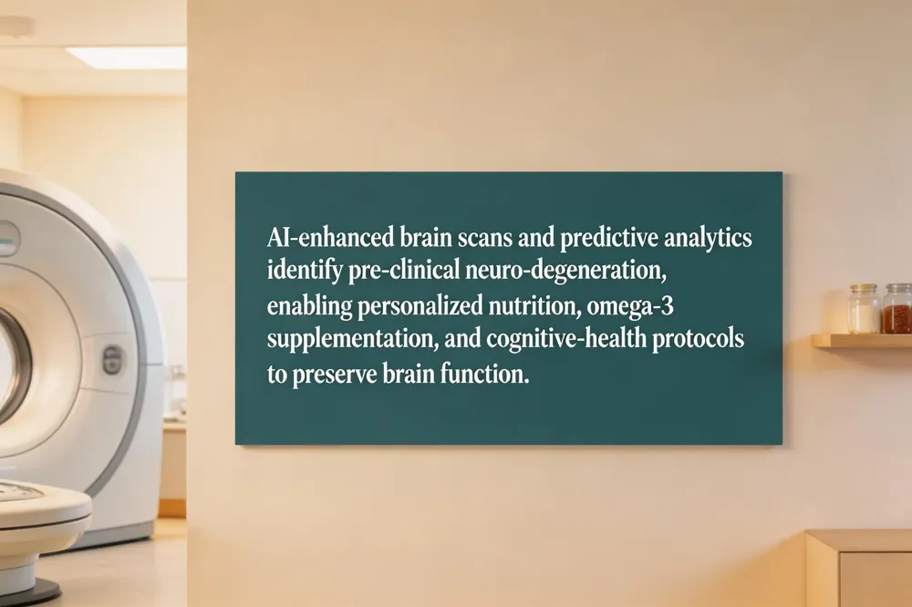 AI Longevity Clinic leverages AI‑enhanced brain scanning combined with predictive analytics to identify subtle neuro‑degenerative changes before clinical symptoms appear. Advanced MRI protocols and machine‑learning models analyze cortical thickness, white‑matter integrity, and amyloid‑related patterns, generating a personalized risk score that is continuously updated as new data arrive. The clinic pairs this diagnostic power with individualized cognitive‑health protocols that integrate nutrigenomic‑guided nutrition, targeted omega‑3 supplementation, circadian‑aligned sleep hygiene, and structured mental‑stimulation activities. Each protocol is calibrated to the patient’s genetic profile, biomarker panel, and lifestyle preferences, ensuring a truly data‑driven approach to brain health.