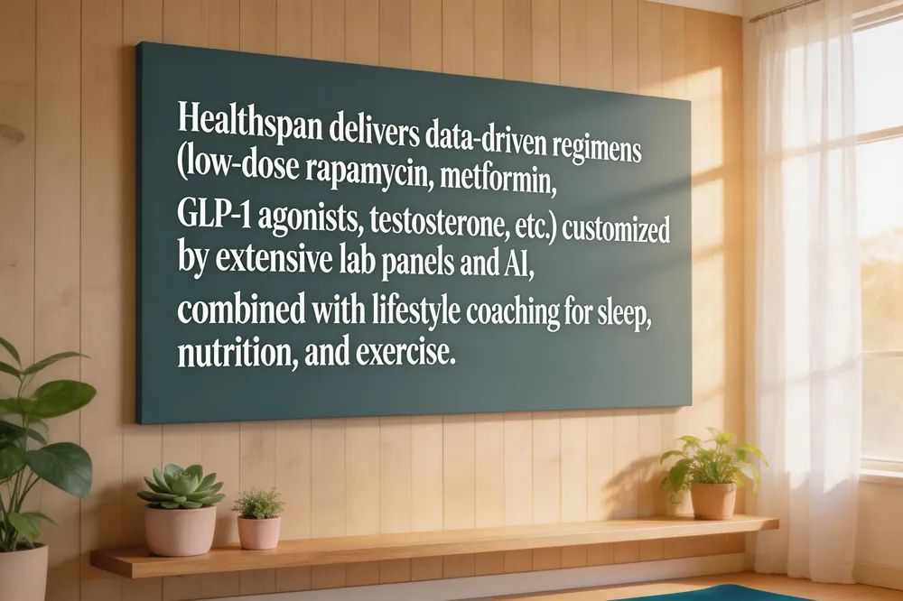 Healthspan Labs offers comprehensive 100+ biomarker testing, with results interpreted by MDs and PhDs to tailor protocols—including Rapamycin, metformin, hormone replacement, and GLP‑1 therapies—while providing ongoing nutrition, exercise, and sleep coaching.
