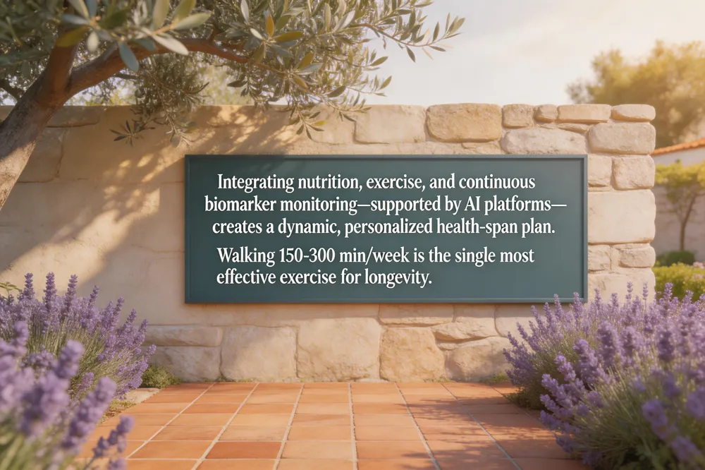 Integrating nutrition, exercise, and biomarker monitoring is the backbone of modern health‑span optimization. Advanced clinics such as Healthspan, the Medical Institute of Healthy Aging, and the Preamble Program use DEXA scans, VO₂ max testing, and panels of 100+ blood markers (LDL, hs‑CRP, HbA1c, vitamin D, etc.) to identify early metabolic and inflammatory shifts. AI‑driven platforms (MySpan, InsideTracker, Human Longevity’s app) synthesize these data with genetics, wearable metrics, and lifestyle inputs, producing dynamic, evidence‑based recommendations that are updated as each new lab result arrives.