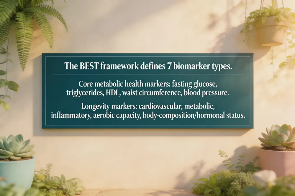 What are the five markers of longevity? Longevity assessment integrates cardiovascular metrics (blood pressure, lipid profile), metabolic indicators (fasting glucose, insulin sensitivity), inflammatory markers (hs‑CRP, cytokines), aerobic capacity (VO₂ max), and body‑composition/hormonal status (muscle mass, visceral fat, hormone balance). Together they provide a comprehensive view of biological age and guide personalized health‑span interventions.