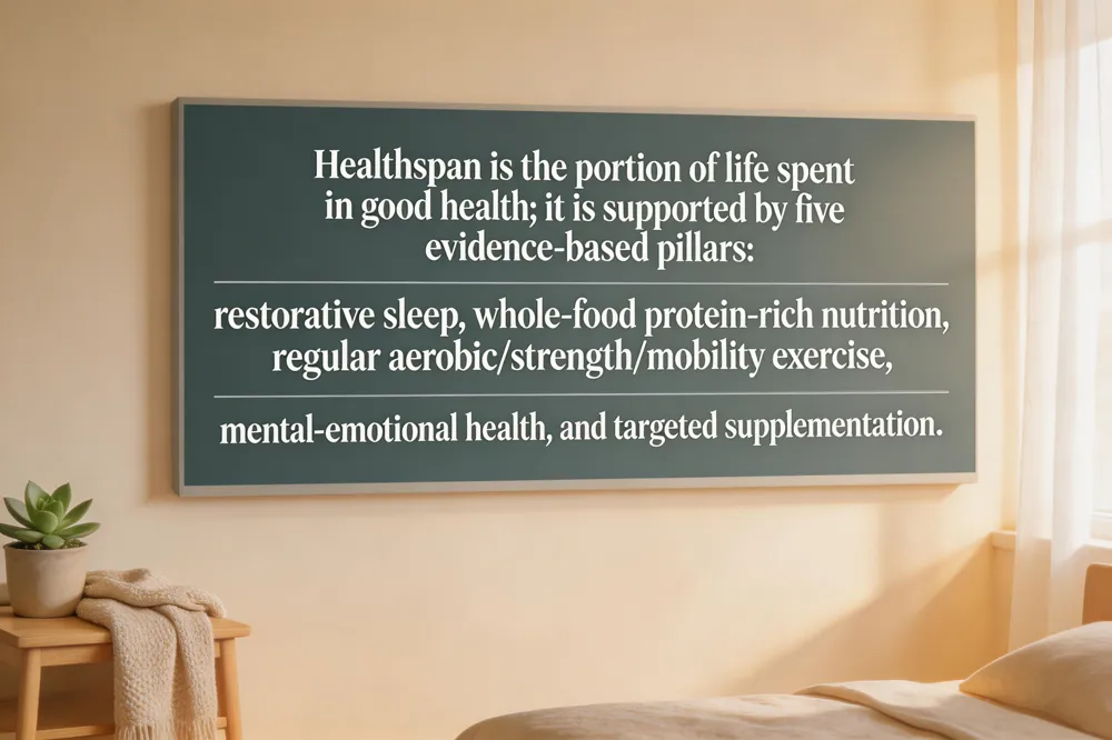 Extending healthspan hinges on five evidence‑based pillars: restorative sleep, balanced nutrition rich in whole foods and adequate protein, regular exercise that includes aerobic, strength, and mobility work, mental and emotional health through stress‑reduction, social connection, and mindfulness, and targeted supplementation to fill nutritional gaps.