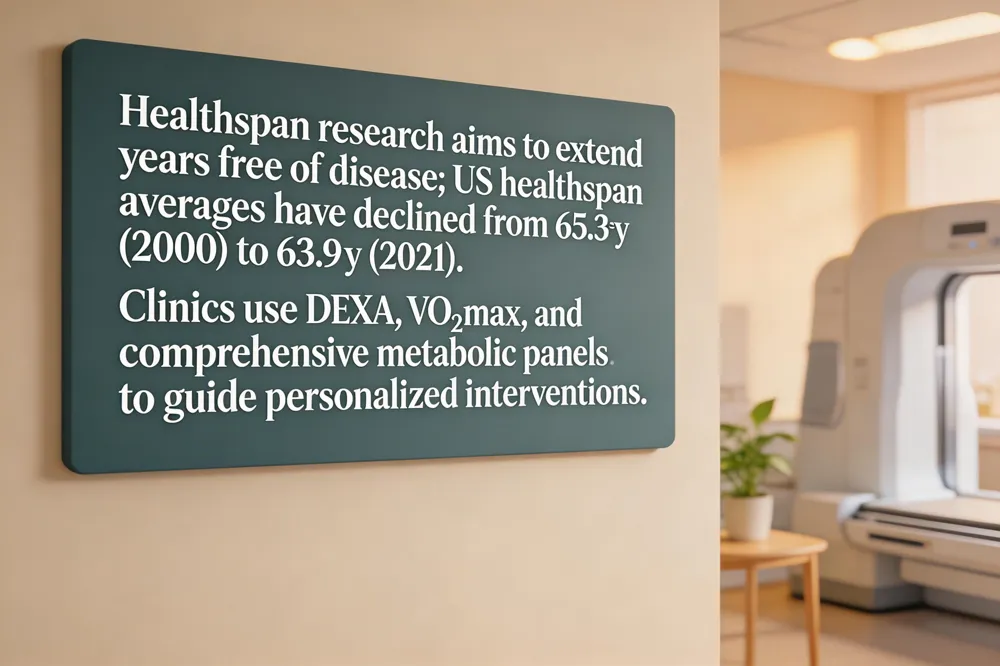 Healthspan USA In the United States, healthspan is the number of years lived in good health, free from significant chronic disease or disability. Data show the average healthspan for U.S. adults fell from 65.3 years in 2000 to about 63.9 years in 2021, exposing a gap between increasing life expectancy and declining healthy years. Extending healthspan involves addressing hallmarks of aging through personalized protocols, regular biomarker monitoring, and lifestyle coaching—services offered by clinics such as the Medical Institute of Healthy Aging.
