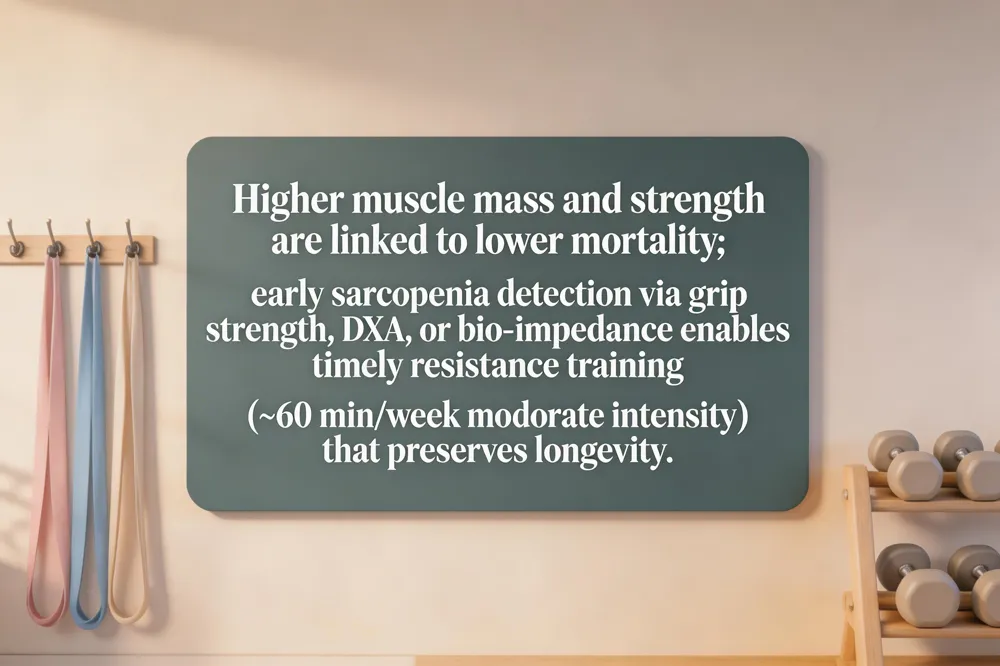 Higher muscle mass is consistently linked to lower mortality. In a nationally representative NHANES cohort of adults 50 + years, low appendicular lean mass doubled the odds of all‑cause death, while each 20‑percentile increase in skeletal muscle index reduced mortality risk by ~14 %. Muscle‑mass index (MMI), skeletal muscle divided by height², is an independent predictor of longevity; the highest MMI quartile showed a 19 % lower risk of death compared with the lowest, even after adjusting for obesity and cardiovascular factors. Strong thigh muscles, especially the quadriceps, are critical for mobility, balance and metabolic health; weak quadriceps raise early‑death risk by 51‑65 % and triple mortality for slow chair‑rise times. Sarcopenia—age‑related loss of muscle mass, strength and function—emerges from hormonal decline, reduced protein synthesis, inactivity and chronic disease. Early detection via grip strength, DXA or bio‑impedance and gait speed enables timely intervention. Strength training mitigates sarcopenia, preserves bone density, improves insulin sensitivity and lowers inflammation. Evidence supports ~60 minutes per week of moderate‑intensity resistance work (two sessions) as optimal for longevity. Regular progressive overload—body‑weight, bands or light weights—maintains muscle quantity and quality, supporting independence, reducing chronic‑disease burden and extending health‑span.