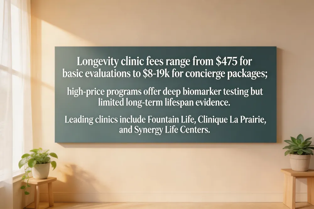 Longevity clinics range from $475 for a basic hormone‑and‑weight‑loss evaluation to $1,200 annual retainers for standard preventive‑age‑management. Comprehensive concierge packages that include whole‑genome sequencing, whole‑body MRI, extensive blood panels, and continuous monitoring cost $8,000‑$19,000. Tiered options such as a $12,000 “100+ Care” plan add wearable monitoring and quarterly follow‑ups, letting patients match testing depth to budget.