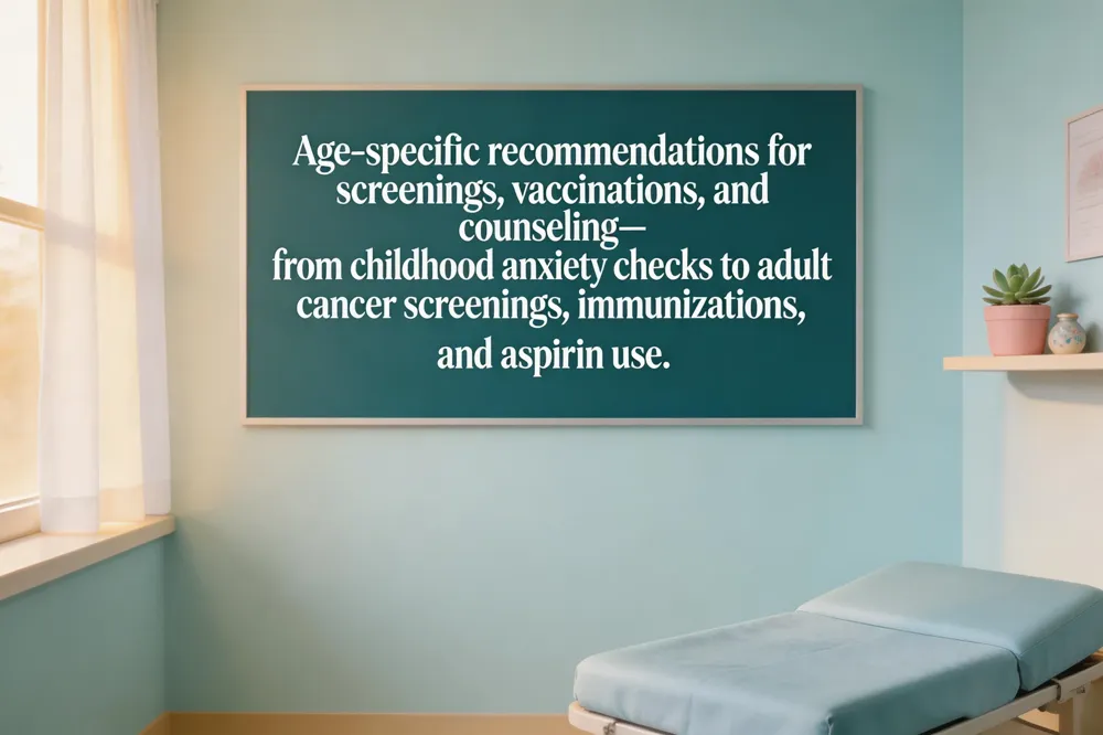 Preventive care recommendations by age – Screening and counseling should be tailored to each life stage. For children and adolescents (8–18 years) anxiety screening is essential, while all adults benefit from routine immunizations and lifestyle counseling. Women begin cervical cancer screening at age 21 (Pap every 3 years or Pap + HPV every 5 years) until 65, and mammography is advised biennially for women ages 40–74. Colon cancer screening (colonoscopy, sigmoidoscopy, or stool‑based tests) starts at age 45 for average‑risk adults and continues through age 75. Men ages 65–75 who have ever smoked should receive a one‑time abdominal aortic aneurysm ultrasound for men 65‑75 who ever smoked, and adults ≥ 50 years discuss low‑dose aspirin for cardiovascular prevention when appropriate. Pregnant individuals are screened for asymptomatic bacteriuria and, if high‑risk, receive low‑dose aspirin to prevent preeclampsia.