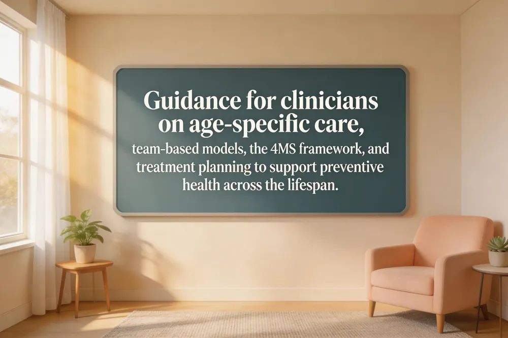 Age‑friendly health systems and the 4Ms framework The Institute for Healthcare Improvement’s 4Ms (What Matters, Medication, Mentation, Mobility) guide age‑friendly practice. Clinicians elicit patient priorities (What Matters), reconcile polypharmacy (Medication), screen for depression and delirium (Mentation), and implement fall‑prevention and strength training (Mobility). Embedding the 4Ms into primary‑care workflows improves outcomes for adults 65+ while respecting individual goals.