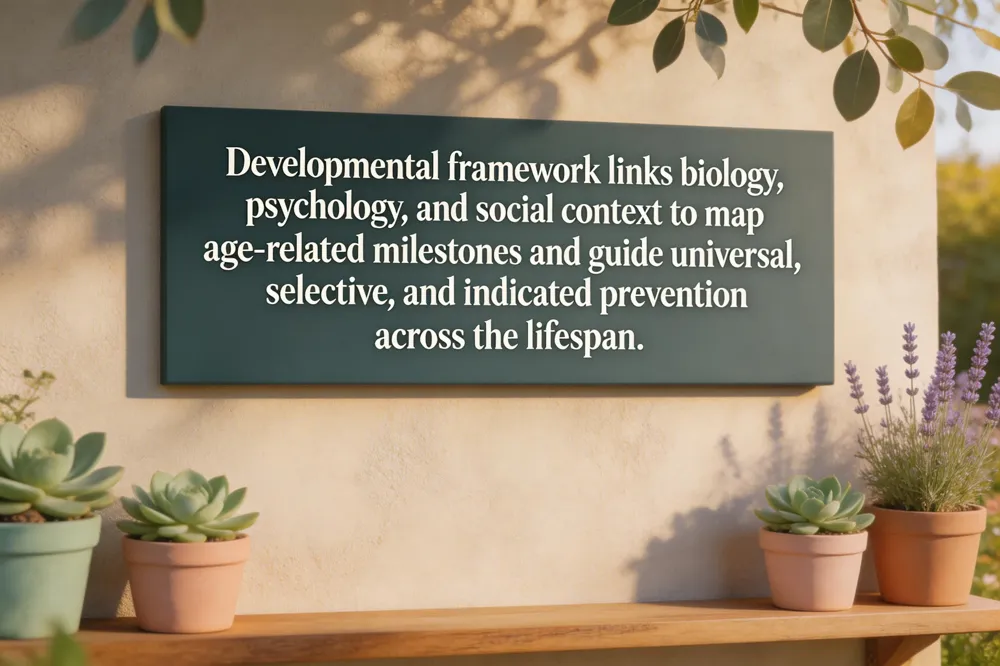 The developmental framework for prevention emphasizes age‑related patterns of competence, ecological contexts, and biopsychosocial interactions that shape health trajectories. By aligning preventive‑care principles—universal, selective, and indicated interventions—with each life stage, clinicians can target proximal risk factors such as parental depression in adolescence or sarcopenia in midlife, while reinforcing protective competencies like secure attachment and school bonding. This age‑specific alignment supports longevity goals by reducing cumulative risk of mental, emotional, and behavioral disorders, delaying onset of chronic disease, and preserving functional reserve, ultimately extending healthspan and improving quality of life. Biomarker monitoring and lifestyle coaching tailor interventions to individual aging trajectories.