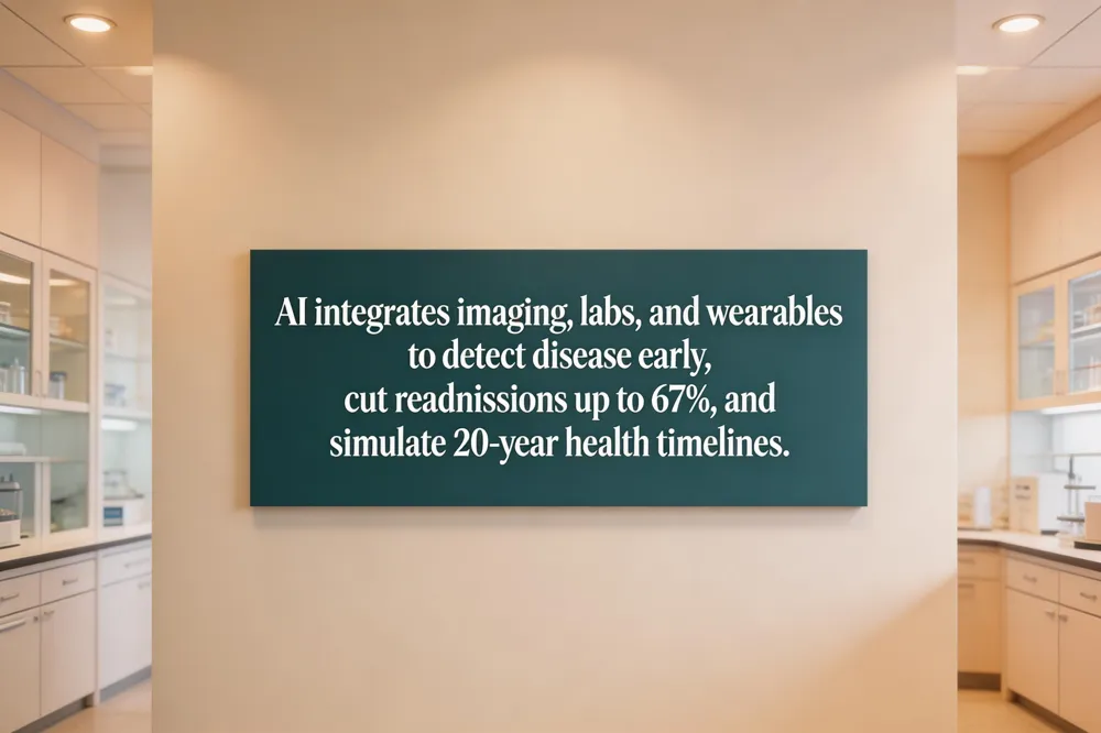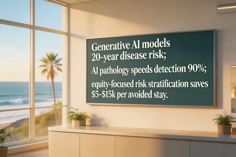 Generative AI models now simulate individual health timelines, predicting the onset of over a thousand diseases up to 20 years ahead. This capability, combined with digital pathology—where AI reduces metastatic‑detection time by 90 % and boosts sensitivity to near 100 %—helps mitigate the global shortage of pathologists and expands multi‑cancer early detection (MCED) programs.