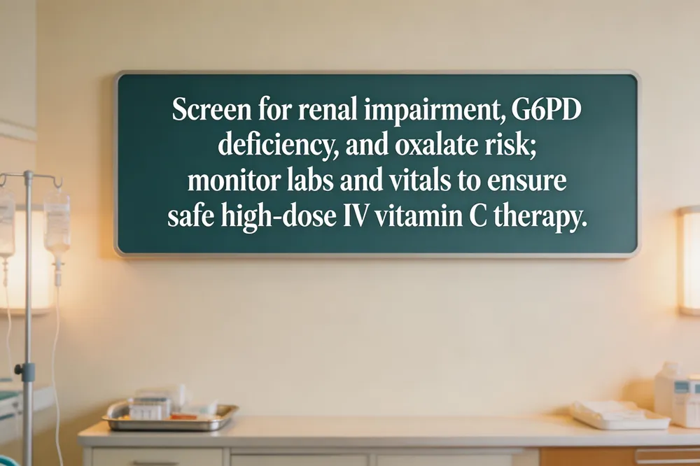 High‑dose vitamin C IV infusions are generally well‑tolerated, but clinicians must screen for renal impairment and G6PD deficiency before treatment. In patients with reduced kidney function or a history of oxalate stones, the large urinary oxalate load can precipitate nephropathy; serial creatinine, urine output, and electrolytes are recommended after each infusion. G6PD‑deficient individuals risk acute hemolysis when exposed to the oxidative stress of pharmacologic IV vitamin C, so a quantitative G6PD assay is mandatory before high‑dose protocols.