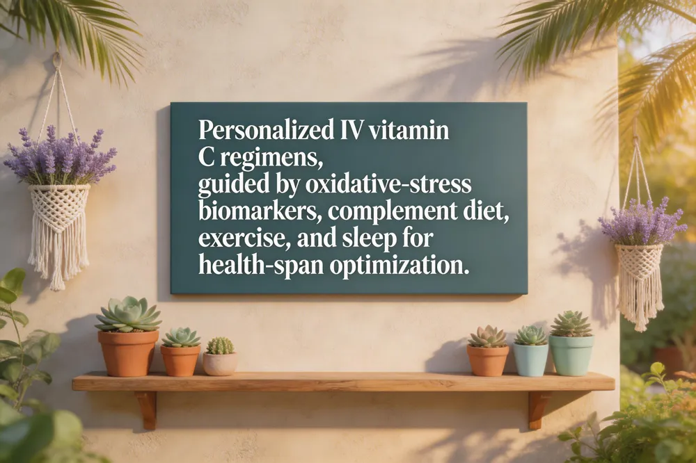 Optimal longevity requires a multimodal approach that couples high‑dose IV vitamin C with core lifestyle pillars. First, IV vitamin C—by delivering millimolar plasma ascorbate—provides a rapid, near‑100 % bioavailable antioxidant boost that can replenish intracellular glutathione, regenerate vitamin E, and support collagen‑dependent tissue repair. When paired with a diet rich in fruits, vegetables, and polyphenols, the infusion augments a baseline antioxidant network while the food‑based nutrients maintain steady‑state vitamin C levels (≈70‑100 µM). Second, regular aerobic exercise and adequate sleep enhance endogenous antioxidant enzymes (SOD, catalase) and improve endothelial nitric‑oxide availability; IV vitamin C can further reduce oxidative stress markers (malondialdehyde, CRP) and support immune cell function during recovery periods. Third, personalized screening—renal function, G6PD status, iron overload, and baseline plasma ascorbate—guides dosing (10‑50 g) and frequency (weekly or bi‑weekly) and enables monitoring of electrolytes and oxalate load. Evidence suggests modest improvements in vascular health, skin elasticity, and quality‑of‑life, but robust lifespan extension remains unproven; thus, patients should view IV vitamin C as an adjunct to evidence‑based nutrition, exercise, and sleep rather than a standalone anti‑aging cure.