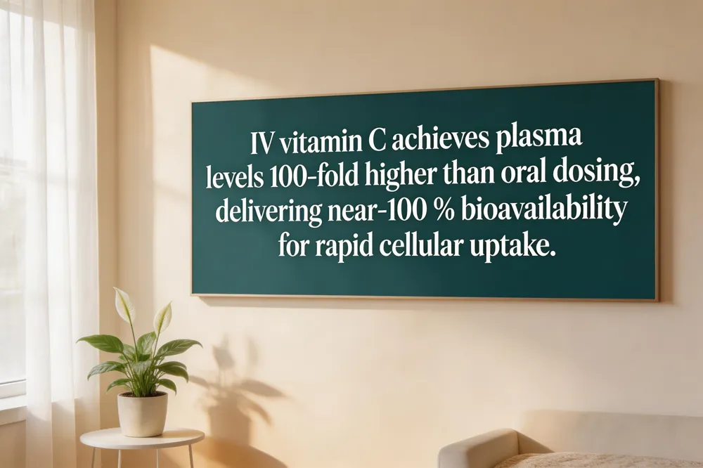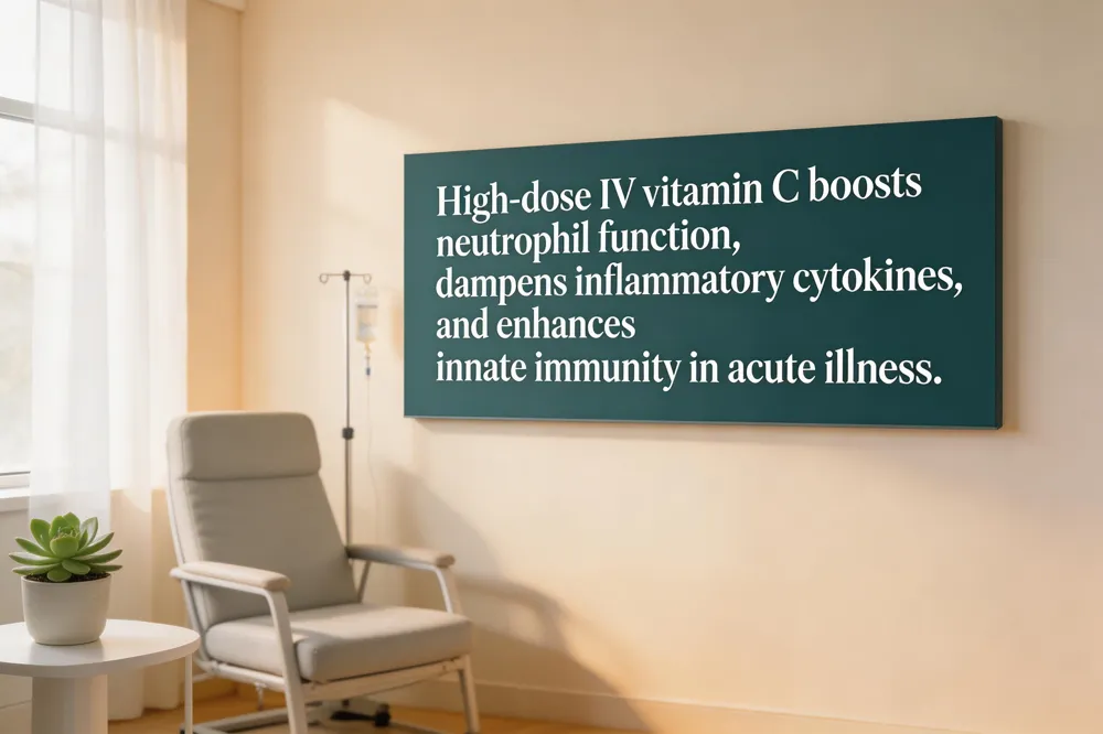 High‑dose IV vitamin C delivers near‑100 % bioavailability, producing plasma concentrations 10‑ to 100‑fold higher than oral dosing. This pharmacologic surge enhances neutrophil oxidative burst and chemotaxis while suppressing pro‑inflammatory cytokines such as IL‑6, TNF‑α, and IL‑1β, thereby improving innate immune defense. Clinical trials in sepsis and severe viral infections report reduced organ‑dysfunction scores and shorter intensive‑care stays, likely reflecting the combined antioxidant and anti‑inflammatory actions. In oncology, adjunctive IV vitamin C has modestly lowered fatigue and treatment‑related side‑effects, though survival benefits remain unproven.