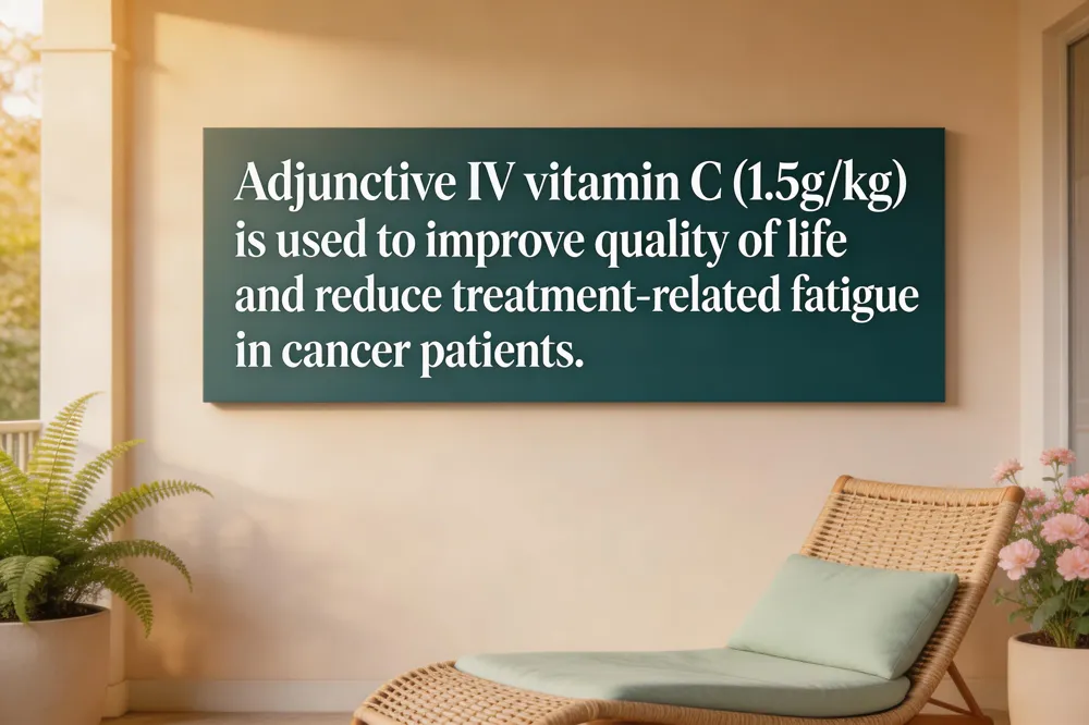 High‑dose intravenous vitamin C is typically given at 1.5 g/kg body weight per infusion, infused over 90–120 minutes and repeated 2–3 times weekly for several weeks. The regimen is used as an adjunct to conventional cancer therapy to improve quality of life and reduce fatigue, not as a stand‑alone cure. Patients must be screened for normal renal function, absence of G6PD deficiency, and no history of hemochromatosis; blood glucose and renal labs are monitored before and after each infusion.