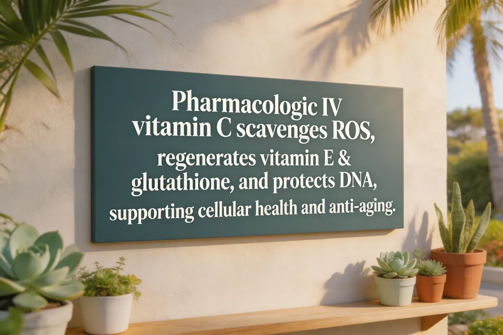 Intravenous vitamin C delivers pharmacologic plasma concentrations (10‑30 mmol/L) that far exceed oral levels, enabling a robust antioxidant defense. At these concentrations the vitamin directly scavenges reactive oxygen species (ROS) such as superoxide, hydroxyl radicals, and hydrogen peroxide, preventing lipid peroxidation, protein oxidation, and DNA damage. It also rapidly regenerates oxidized vitamin E and glutathione, restoring the broader redox network and supporting enzymatic antioxidants (superoxide dismutase, catalase, glutathione peroxidase). Clinical studies show that high‑dose IV vitamin C lowers oxidative‑stress markers (malondialdehyde, F2‑isoprostanes) and reduces pro‑inflammatory cytokines (IL‑6, TNF‑α), which are linked to cellular senescence. By preserving glutathione pools and protecting mitochondrial DNA, IV vitamin C can slow telomere attrition and improve DNA repair capacity, mechanisms implicated in age‑related decline. The antioxidant defense system therefore protects cells by neutralizing RONS, while regeneration of vitamin E and glutathione amplifies this effect. In the skin, reduced ROS limits collagen degradation and matrix‑metalloproteinase activation, supporting elasticity and reducing wrinkle formation. Overall, the combined scavenging, regeneration, and telomere‑protective actions of IV vitamin C form a mechanistic basis for its potential role in healthy aging, though large randomized trials are still needed to confirm longevity benefits.