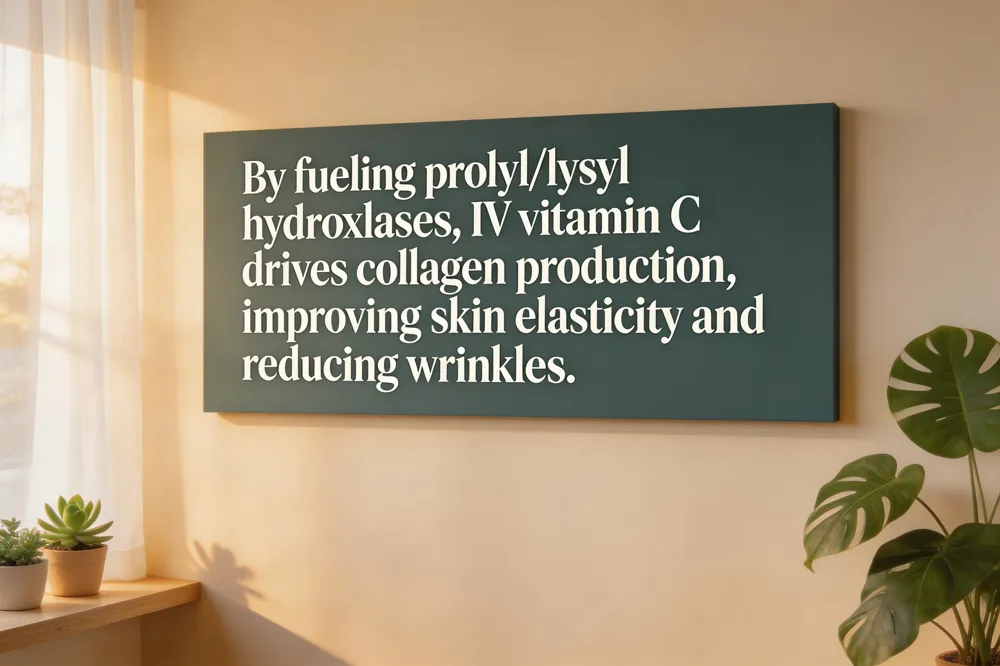 Vitamin C is an essential co‑factor for the prolyl and lysyl hydroxylases that stabilize the triple‑helix of collagen fibers; without adequate ascorbate these enzymes cannot hydroxylate proline and lysine residues, leading to weak, disorganized extracellular matrix. IV vitamin C bypasses gastrointestinal limits, achieving plasma concentrations 10‑100‑fold higher than oral dosing, which translates into near‑100 % bioavailability and rapid intracellular uptake for collagen biosynthesis. Clinically, IV vitamin C infusions have been shown to improve skin elasticity, reduce fine‑line depth, and lessen hyperpigmentation by supporting fibroblast proliferation, enhancing dermal hydration, and inhibiting melanin synthesis. Randomized trials in adults undergoing cosmetic procedures report measurable increases in skin firmness and reductions in wrinkle scores after a series of weekly infusions, while observational studies note smoother, more radiant complexion within days of treatment.