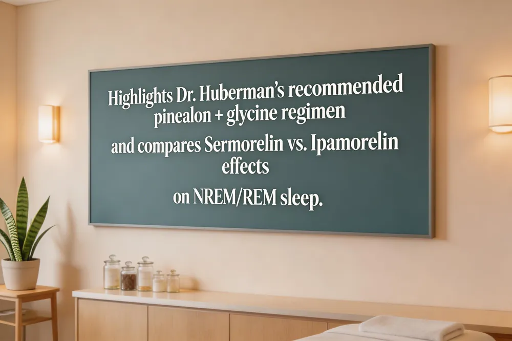 Dr. Andrew Huberman recommends pairing the neuropeptide Pinealon with oral glycine to boost REM sleep. In his own regimen the combination roughly doubles REM duration, though he uses it intermittently rather than nightly. Pinealon, a pineal‑derived regulator, works synergistically with glycine’s NMDA‑modulating properties to enhance REM consolidation.