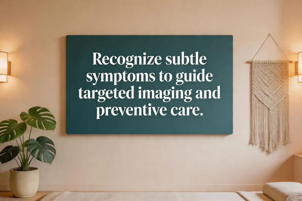 Major disease categories include coronary artery disease (CAD), cardiomyopathy, valvular disease, and arrhythmias. Early warning signs of heart disease are chest discomfort/angina, unexplained shortness of breath, and atypical pain or numbness in the neck, jaw, arms, or back. Early signs of heart failure are dyspnea on exertion or when lying flat, persistent fatigue/weakness, and peripheral edema of the legs/ankles. Symptom patterns guide the selection of advanced imaging: palpitations or chest pain prompt coronary CT angiography or calcium scoring; dyspnea and fatigue trigger cardiac MRI for ventricular function and fibrosis; unexplained neurological symptoms may lead to carotid ultrasound or PET for plaque inflammation. Integrating symptom‑driven questionnaires with imaging refines risk stratification and enables personalized preventive interventions. These imaging results, combined with biomarkers such as high‑sensitivity troponin and NT‑proBNP, allow clinicians to tailor lifestyle, statin therapy, and, when needed, minimally invasive procedures, supporting longevity‑focused health optimization.