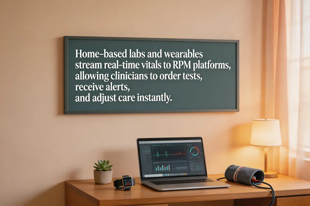 Home‑based laboratory testing and wearable sensor data have become core components of modern telehealth workflows, enabling continuous risk stratification without a clinic visit. Patients can collect blood, saliva, or urine specimens at home (e.g., through Labcorp OnDemand or point‑of‑care devices cleared by the FDA) and have results uploaded securely to the provider’s electronic health record within 24–48 hours. Wearables such as smartwatches, continuous glucose monitors, and Bluetooth‑enabled blood‑pressure cuffs transmit vital‑sign streams in real time to remote‑patient‑monitoring (RPM) platforms, which generate automated alerts when thresholds are crossed. Integrated telehealth portals combine these data streams with AI‑driven analytics, allowing clinicians to adjust treatment plans, prescribe e‑prescriptions, and schedule follow‑up video visits instantly.